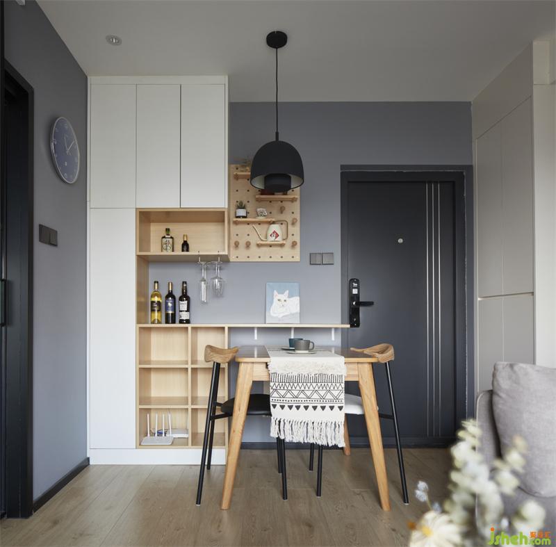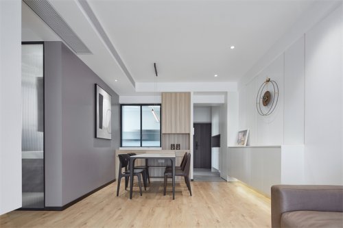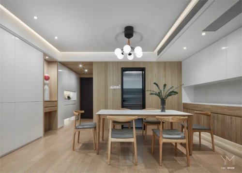 入户左手边鞋柜到顶这样储物量也够,右手边的餐边柜白木结合,虚实对比,收纳了整屋强弱电箱位与家用DYSON工具柜。哈哈更重要的是餐桌可以收纳推进去一个柜位,朋友到访可以拉出来,平时两口放进去就餐也都很不错。