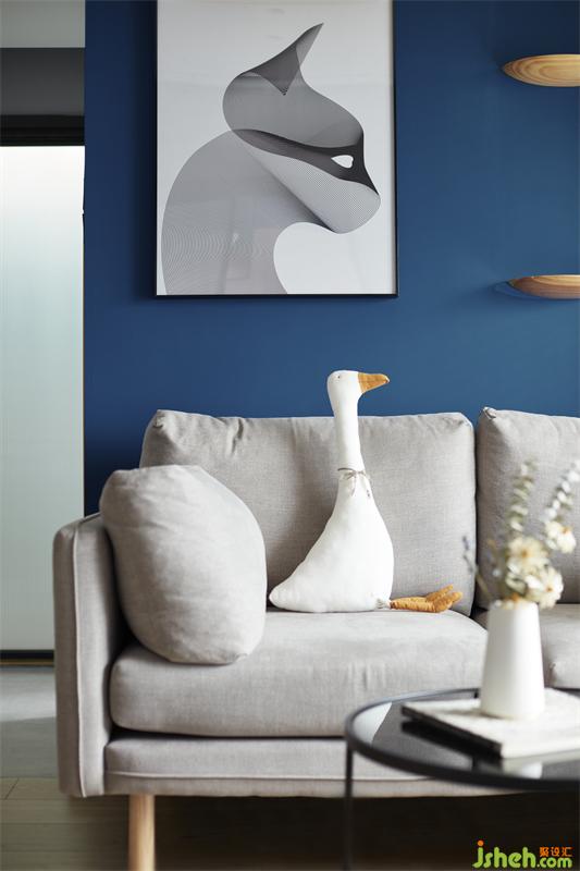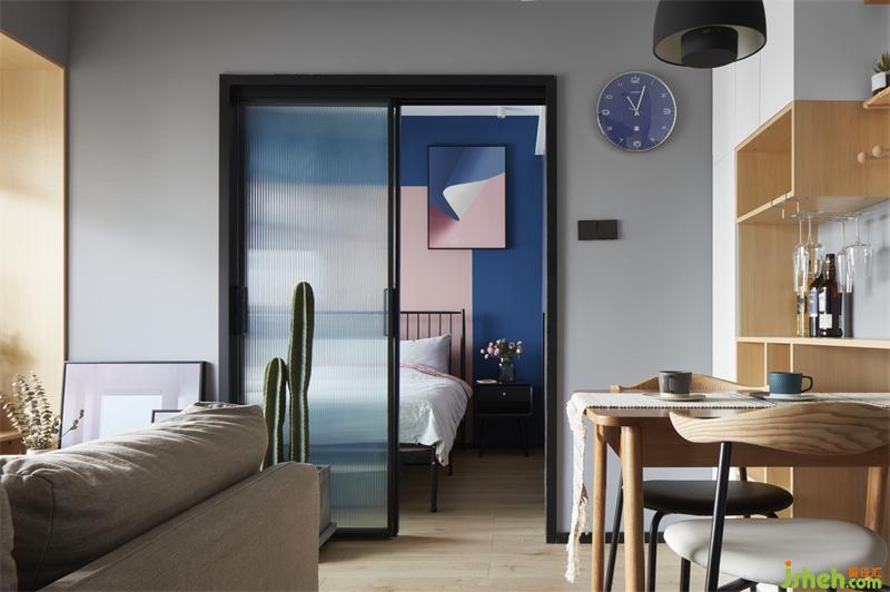 站在客厅望卧室,犹抱琵琶半遮面的情景,是否好有神秘感。背景蓝与粉的结合直入眼帘,给人安静及温馨的画面。