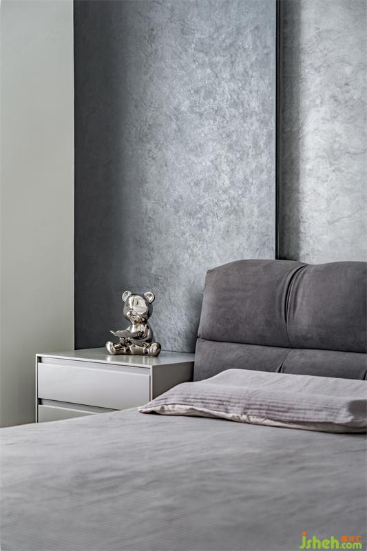 一眼望去,低饱和度的灰系艺术涂料在卧室蔓延质感,深圳装修设计营造出寥寥点缀的分寸感,于考究中释放高级感。