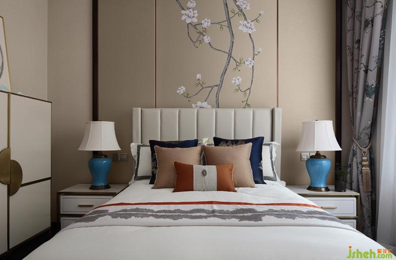 主人房的设计简洁而宁静,配色高雅,舒适自然。木制寝具、柜子,绸缎绣花窗帘,点缀的蓝、橙色家居摆件均温和又具人情味。