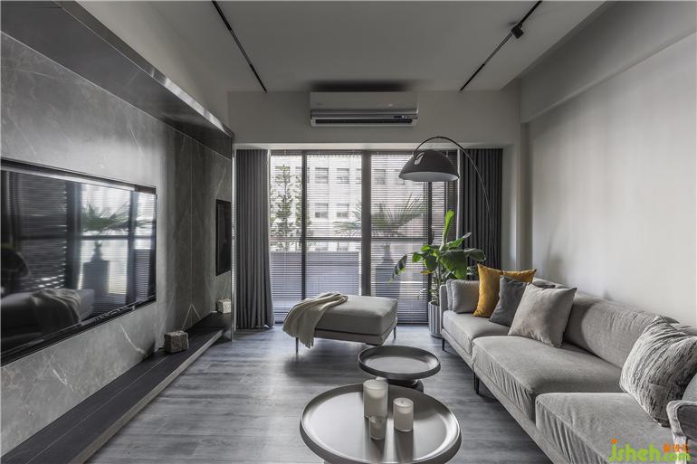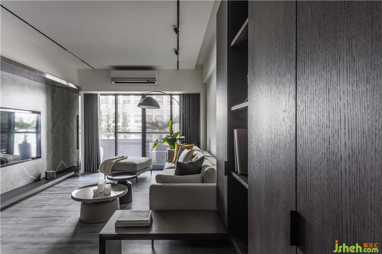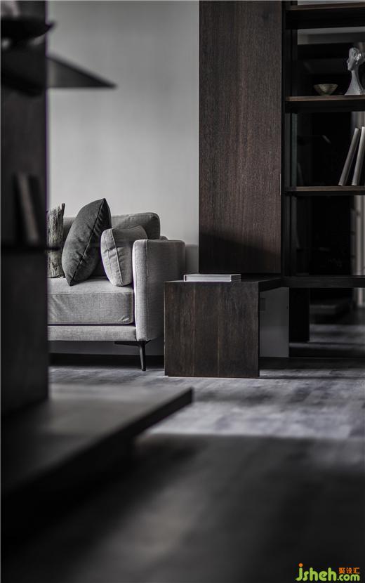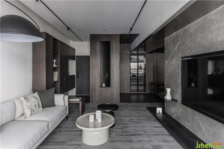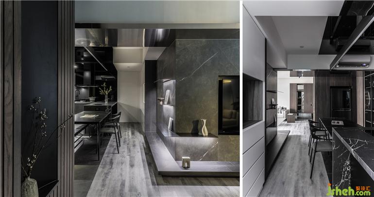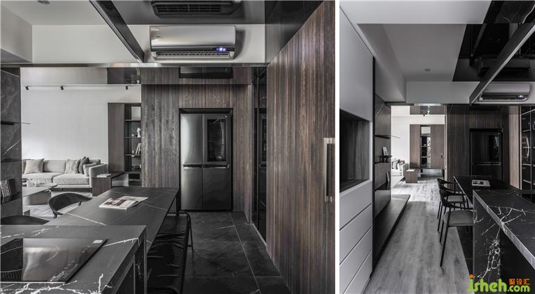 材质: 意大利大版磁砖,橡木实木皮染灰,耐磨海岛型地板,毛丝面不锈钢、灰镜、火山岩、黑砂黑铁件