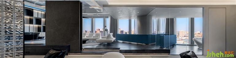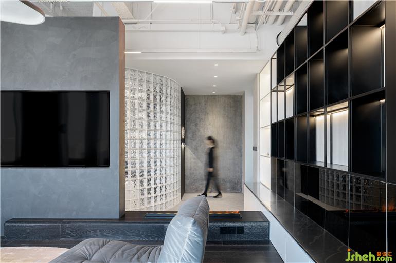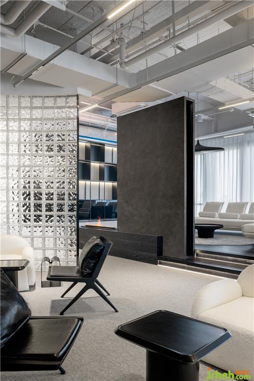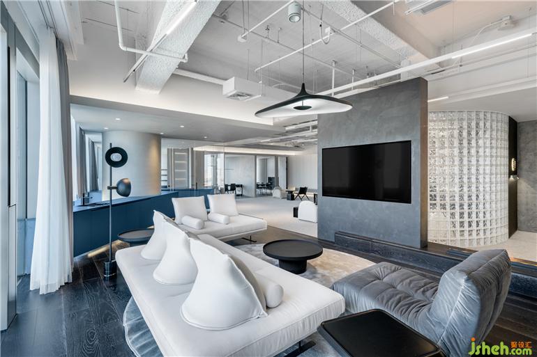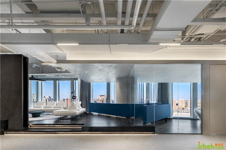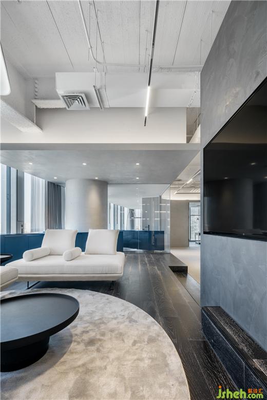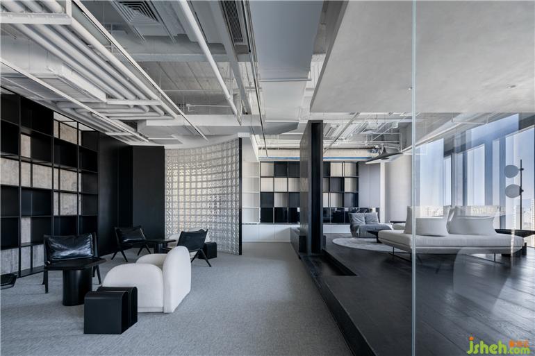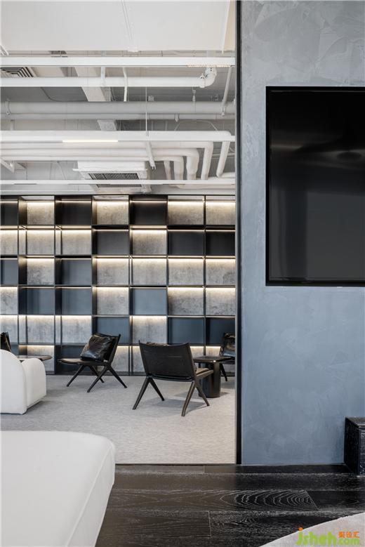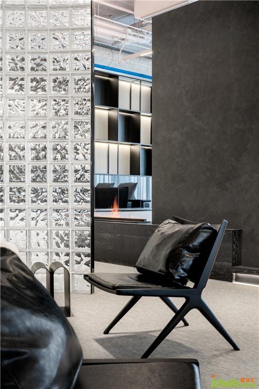 刚进入空间,视线从玻璃砖弧墙的侧边穿越而过,办公室设计隐约可见宽敞的办公室布局,左侧为会客室与品酒区,右侧为书法茶室、主管办公室、开放办公区。会客室与品酒室以圆柱做为二区的分界,并规划水吧区做为二区的缓转处所,弱化圆柱突兀的沉重量体。我们以不对称的天地结构迭架出二区的空间框架,会客室的地坪架高,突显该区的场域感,透过局部裸露的管线,营造出天花增高的视觉效果,空间的后半部则将天花局部封顶,延伸至整间品酒室,光滑平整的水平面,即是延伸,也是扩展。会客室与品酒区一高一低的结构层次,以及水吧区的中继转换,共同赋予了空间比例上的安定与协调,户外远处景观尽收眼底,结合工作与休闲感受。