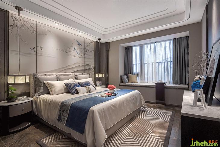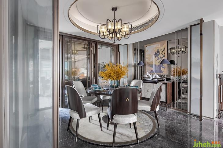 设计是人和人、人和物以及人和空间凝聚的重要媒介。一幅水墨画,抑或是一个白瓷瓶,都能成为主人个性的延展。设计师采用高级灰咖色系为主色调,绯红、深蓝为点缀色,拉丝铜、皮革、花鸟、艺术摆件等在内的元素,让空间营造出高雅宁静的人文意境。主卧连通衣帽间与独立卫浴,龟裂的石材纹理搭暖色的中式吊灯,为主人营造私密惬意的沐浴氛围。