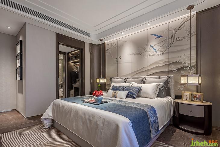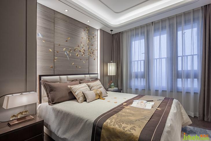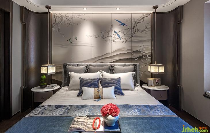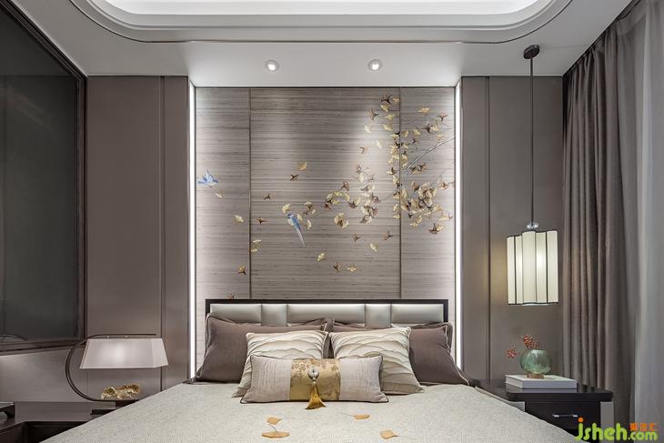 老人房依然延续了端庄沉静的东方气质,是一个全然放松身心的场所。银杏元素融入在手绘背景墙和床头台灯等细节中,将和谐长寿的传统寓意带入居住空间。悬挂式衣柜搭配木色茶台,不经意的松景和停驻的飞鸟,为生活造境,人类与自然于此交汇相融。