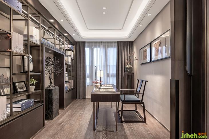 书架运用博古架的形体结合现代材质的钢条,镂空的不对称设计使书房更加通透,四出头式官帽椅造型圆润灵动,端庄大气。书桌对景以一件艺术装置“自然隐喻”,它超然的黑色金属体状,使空间和感观都溢出向上生长的力量。