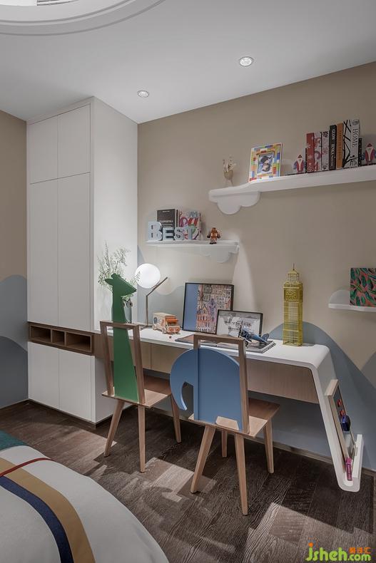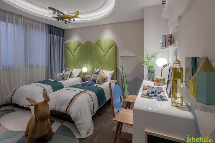 儿童房则以清新的绿色森林系主题从整个空间氛围中跳脱出来,随处可见的动物元素和山峰、云朵、飞机造型,为孩子构建了一个童真童趣的空间。设计师精心设计了一体式的衣柜书桌,合理规划了生活和学习的区域。
