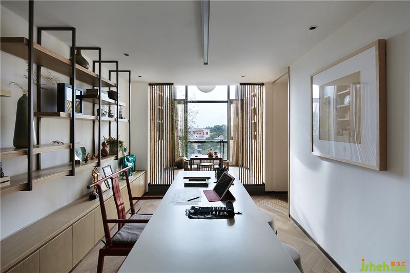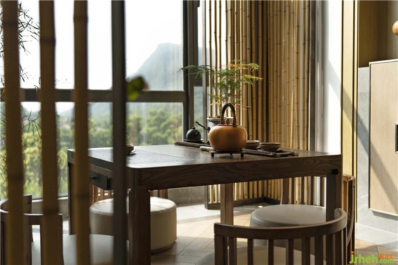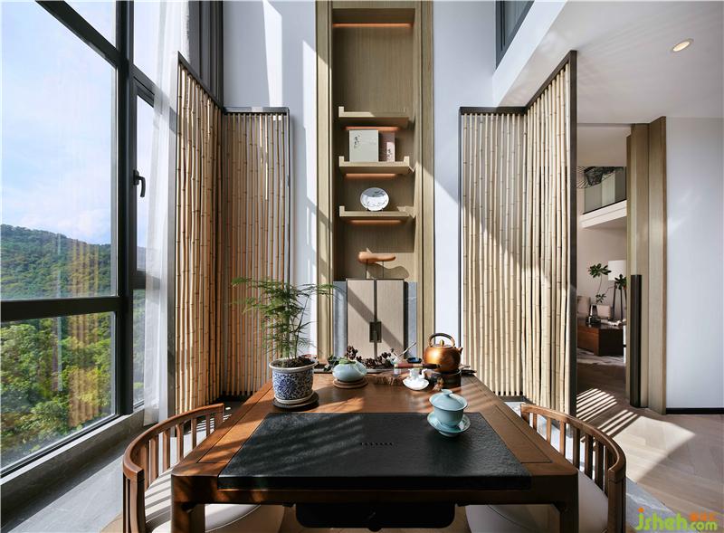 深棕色的茶台、雅致的器物陈设,再衬以几株疏竹,盎然绿意之中,营造出一种空灵通透、素雅静谧的空间气质。