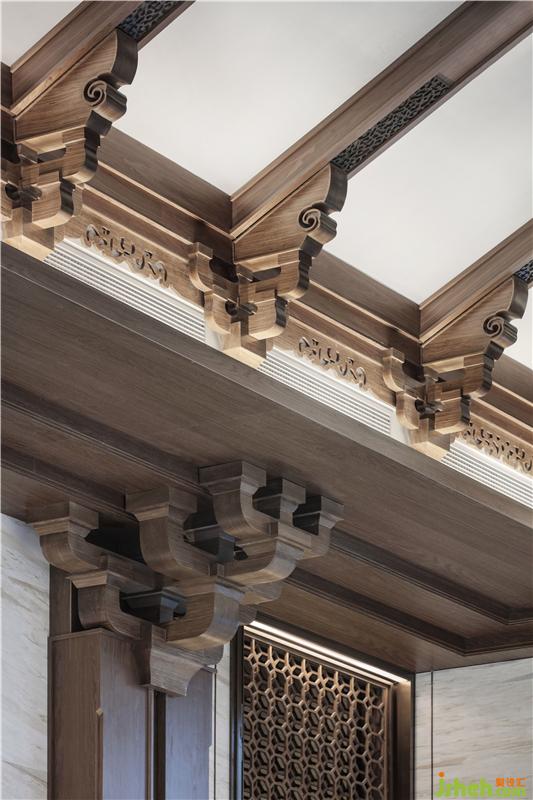 “山”为风骨,“云”为志向。接待台区背衬巨幅漆画木雕花,将山、云元素精镂细刻,融为一体。驻足观瞻之际,仿佛身已在深山中,山中有云,云中有山,空间的禅意被自然地渲染而出。两侧对称置暖色灯带,带来一丝安静与温润气质。接待台辅以水晶玻璃砖饰之,与古铜色不锈钢形意合一,都市文化与传统气息于此交融。装修设计