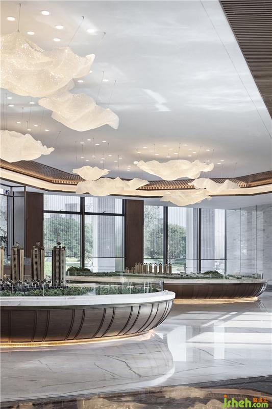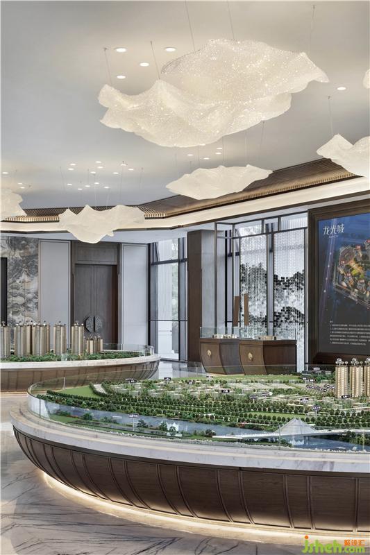 模型图后另设山水纹水晶玻璃屏风,繁缛而有节,化为映像的细声,既是美的展示,又适宜空间的分割,影影绰绰之间感受“清风徐来,水波不兴”之境。装修设计