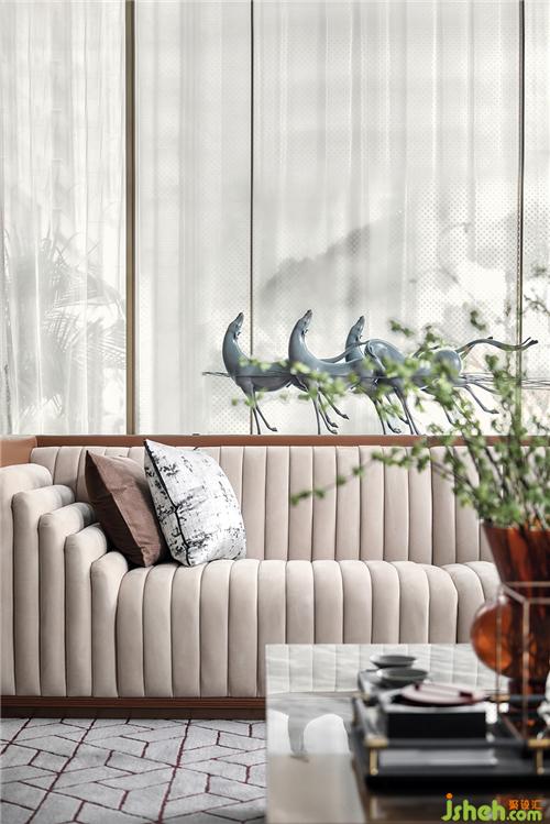 样板房设计师以《山海经》的神话故事和民间典故为主线,融入合域原创家具、具有收藏价值的当代艺术家雕塑及装置艺术作品丰富整个空间的软陈搭配,赋予整个空间更高层次的艺术氛围。
