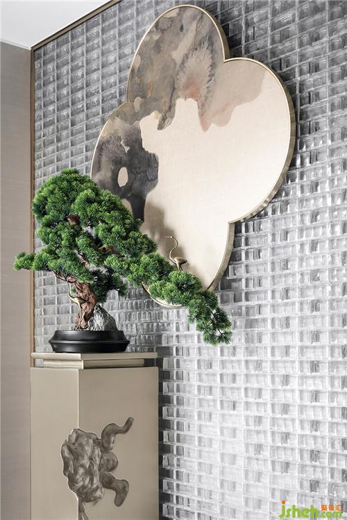 进入门厅,玻璃砖造型屏风映入眼帘,设计师从采光的需要来考虑,为了能让光线洒入室内在屏风背后通过照壁的设计形成一个通而不透的效果。