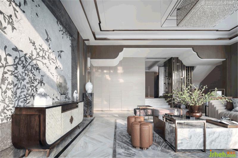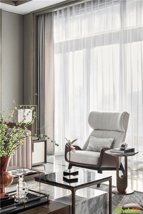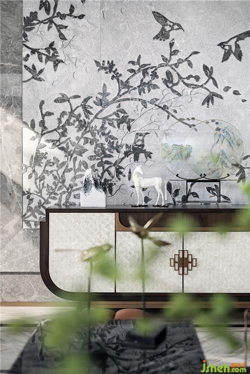 客厅主背景墙以《闹春》为主题概念,采用了3.2米高复合工艺花鸟石材背景墙,光面、水洗及喷挖三种工艺,让石材呈现出具有肌理感的表面,结合花鸟图案,展现空间的主题与雅致格调。双层透叠艺术玻璃屏风,与庭院虚实掩映。