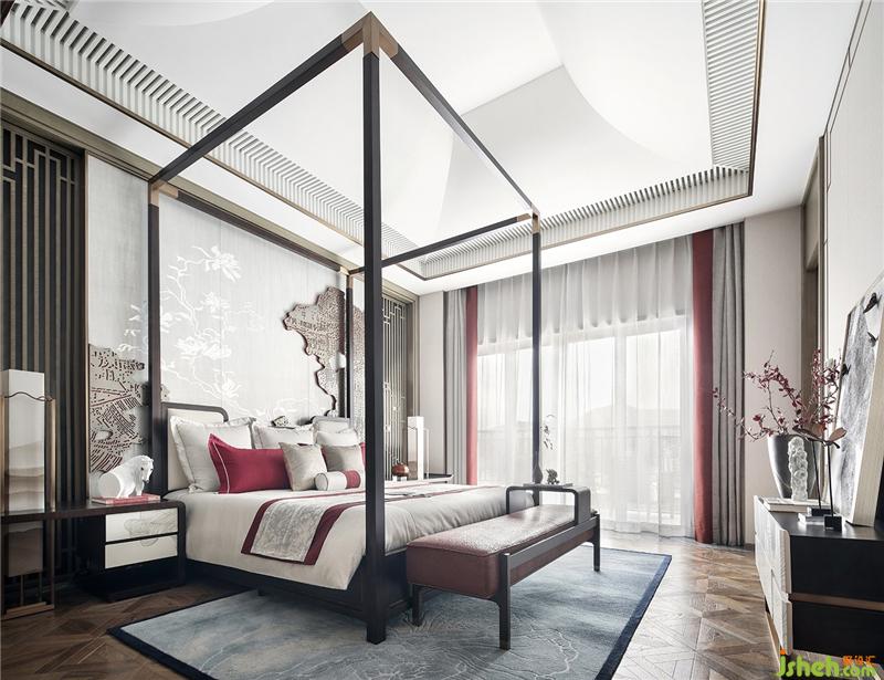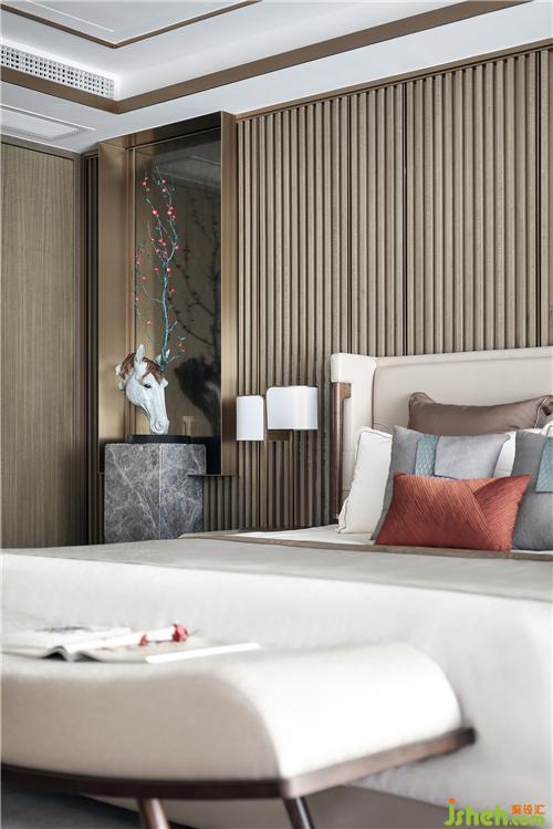 三层主卧的设计灵感来自“庄周梦蝶”,是以灰色调为主导的色彩呈现。使其成为一种东方的,简洁的独特风格。围幔形天花造型契合建筑形态,轻柔自然,主背景墙山石、花蝶相映成趣,原创家具与灯具自然融入空间,软硬装一体化的手法,恰到好处的诠释了东方生活美学。