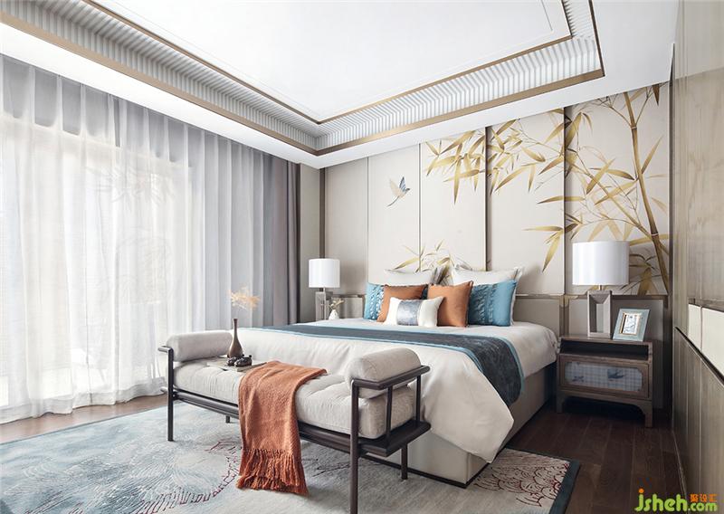 二层次卧总体配色轻松闲适,样板房设计以“竹林飞鸟”为主题的床背巧妙设计成推拉窗,既可通风又私密,取于山水自然又归于自然,轻灵而悠远。