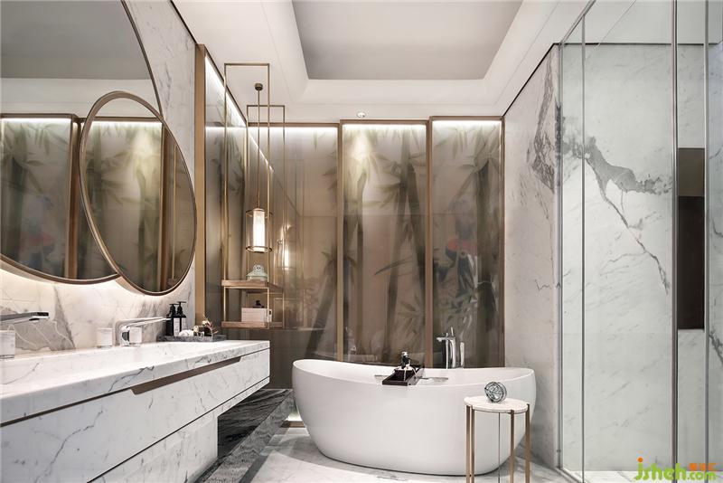 “莫听穿林打叶声”主卫艺术玻璃屏风上的竹韵鸟鸣,黑白灰与墨绿色的交织,典雅别致,光影摇曳,仿佛置身于兼工带写的水墨情境中。