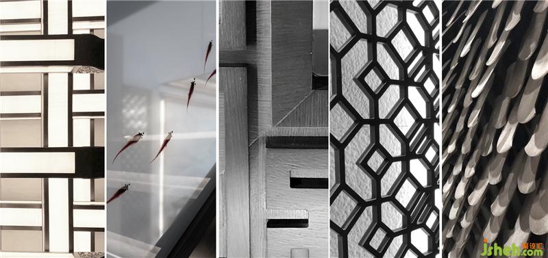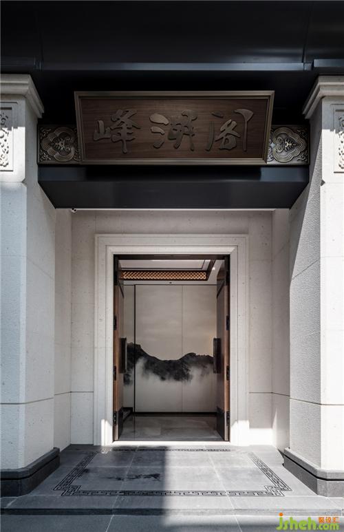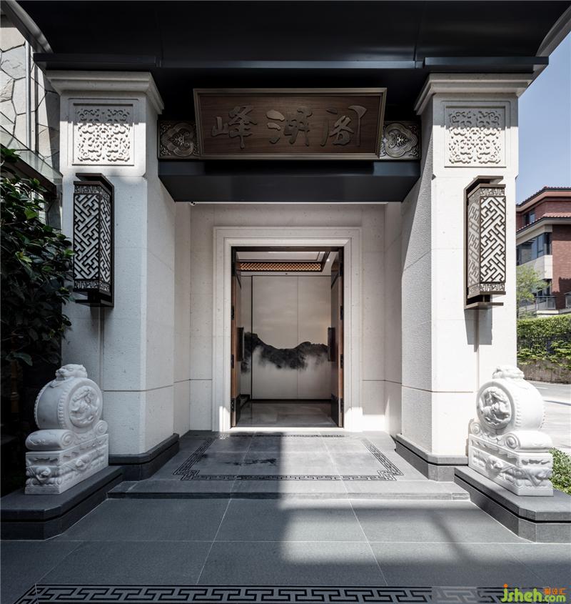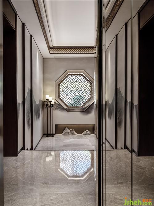 门厅的设计上,一方八边镂空花窗,几处嶙峋山石,延引岭南山水入内;水墨色体块墙面层次堆叠,顶部融入东方吉祥纹样,自然生发空间礼序与入宅仪式感。