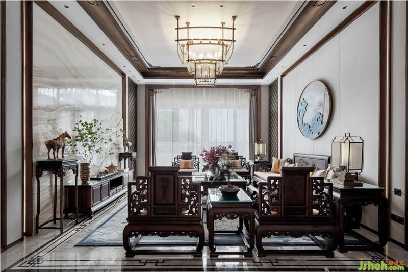 对于客厅的设计,庄重之下透露出克制的张扬,宫灯造型的水晶艺术吊灯、台灯,承续转合,搭配规整典雅、古韵悠然的红木家具,古意与现代的结合,入室之后短暂的肃穆,将户外的喧嚣摒除,再则便是满心的静谧与安然。