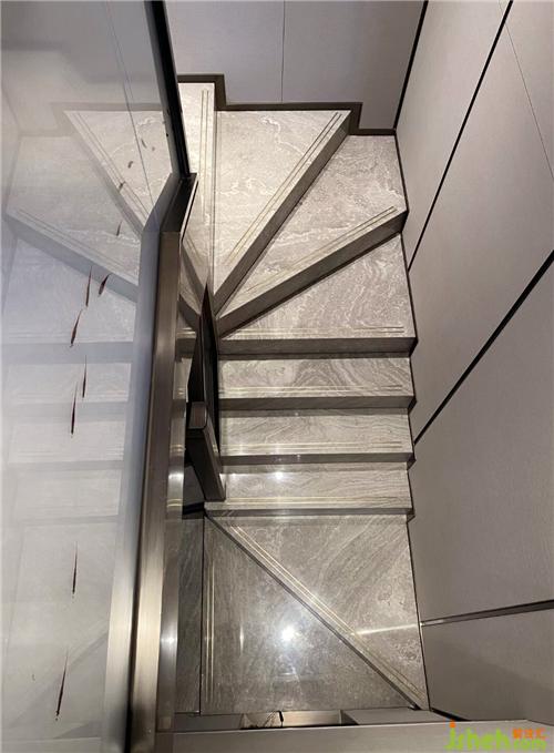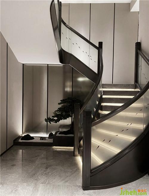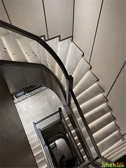 楼梯的打造是空间的重点,采用暖灰色大纹石材铺设,搭配金色的槽线,含蓄而张扬。夹丝玻璃挡板与古铜钢框架扶手的组合,有若“淡淡流水载轻舟,悠悠鱼儿水中游”。整个楼梯作为空间主轴,上下联合,层层叠叠的序列感,衍生空间的意趣。