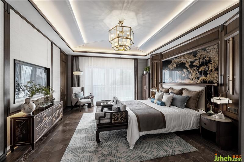 松与鹤喻性高洁,主卧背景墙金箔艺术漆画松鹤图,显露一家之主对“德”的看重,也是儿孙传承、家族延续的核心,“德不孤,必有邻”,不必陋室,一言一行,一器一物,皆是彰显。