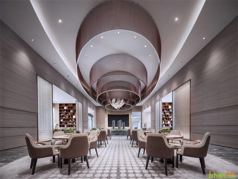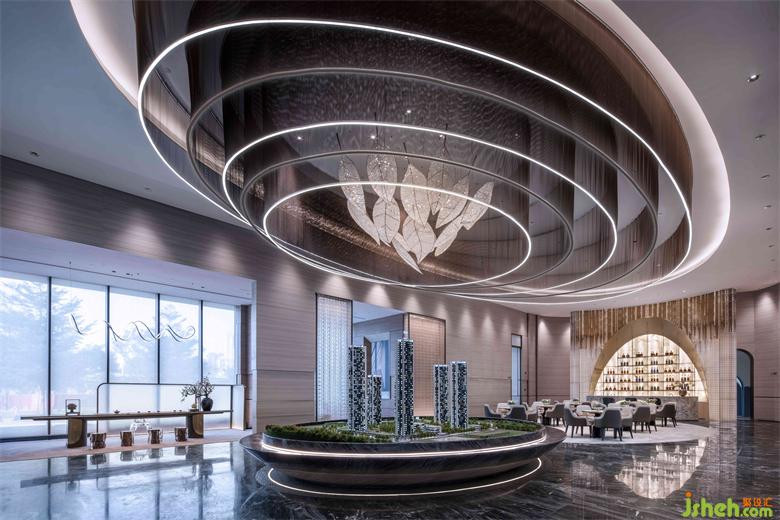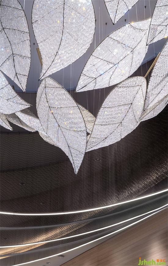 流动是水的永恒,深圳营销中心设计提取流水涟漪意象予以艺术化重构,将金属帘以阵列感层层散开,其蜿蜒的形姿于节奏感中散溢出清透高雅的美感,亦如大地之眼,使空间变得富于张力,也成为空间的灵魂及视觉焦点。