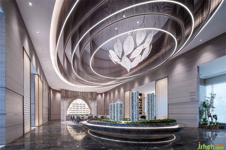 空间本来没有界限,打破人为的功能限制,深圳营销中心设计将水吧与浅洽区、沙盘展示功能融为一体,把控空间的节奏,将私密与开阔性控制在微妙之中。通过繁花绽放为主题的艺术吊饰的相互联系,在光影作用下,灯饰、墙面及局部镜面天花生成幻境般的光影流动。