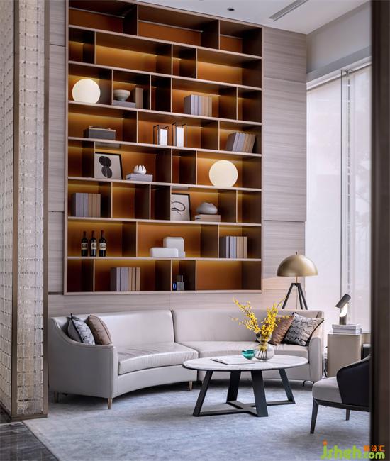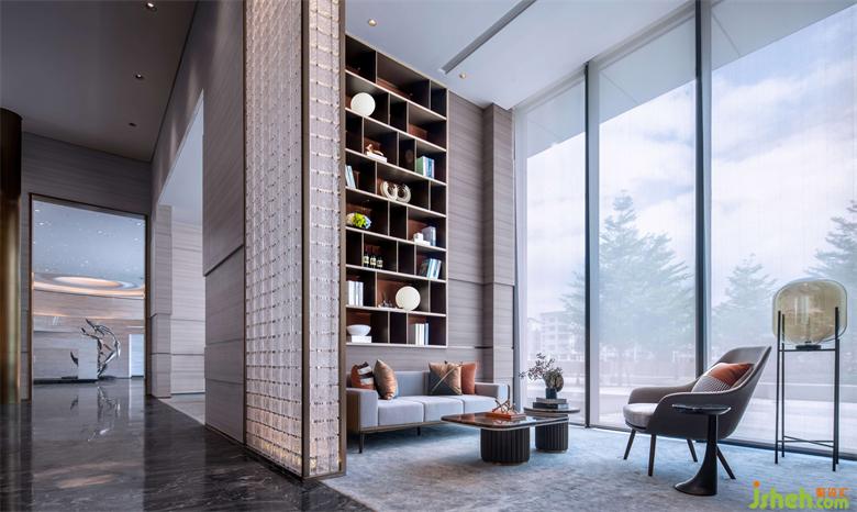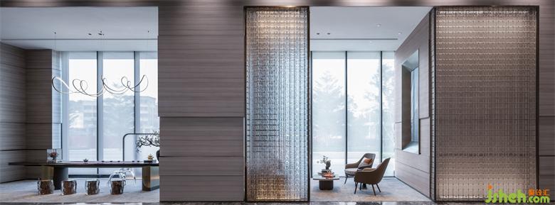 洽谈区以四面围合的形态环绕沙盘空间,深圳营销中心设计以玻璃砖墙打造空间的界限与连接,营造澄澈通透的情境体验。结合室外的景观、碧蓝天空,植入洽谈功能,在繁华的都市中感受“长烟一空”、“渔歌互答”的宁静悠然。