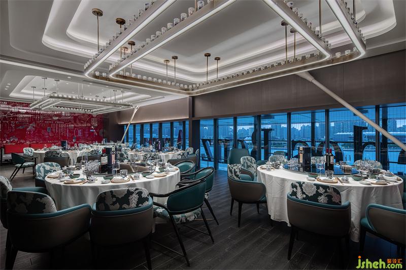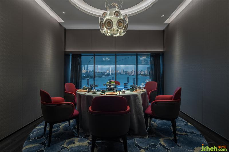 悦江餐厅的另一设计特点,是餐厅的灯光与照明设计,灯光的设计需在客人的用餐体验和艺术展示体验中找到较为恰当的平衡的,灯光不仅能有效规划营造出空间的商业场景氛围需求,同时也能带给客人高品质的艺术观赏体验。灯光的设计在此起到了至关重要的作用。