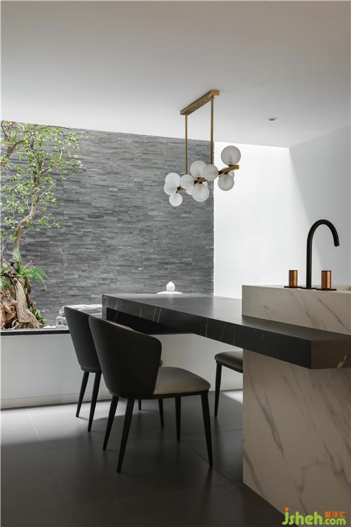 叠墅设计為了打破空間的局限性,設計師把下沈庭院打通至負二層,將原有的封閉式樓頂,開出一口采光井,線條幹練有力,讓外部光線自然傾瀉下來,照亮室內,使整個空間都獲得了自在的呼吸之柱。