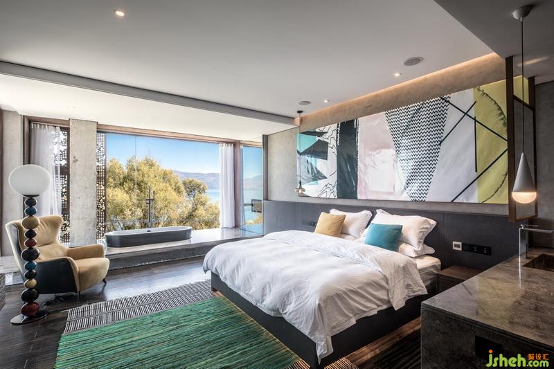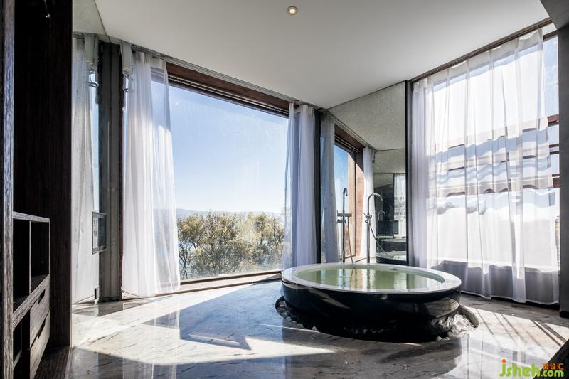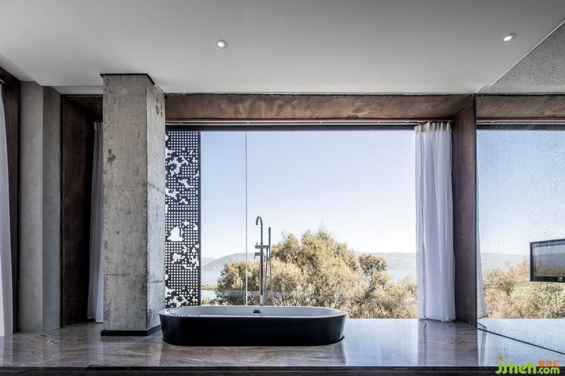 客房的设计也遵循这个原则。整面的落地玻璃窗,裸露的水泥墙面,白色的天花,把窗外的风景放大。窗边做了观景台,浴缸镶嵌在地面中。泡澡看星空时,沉浸在山海的怀里。