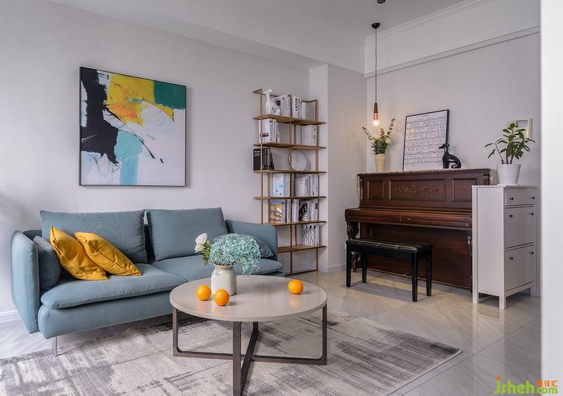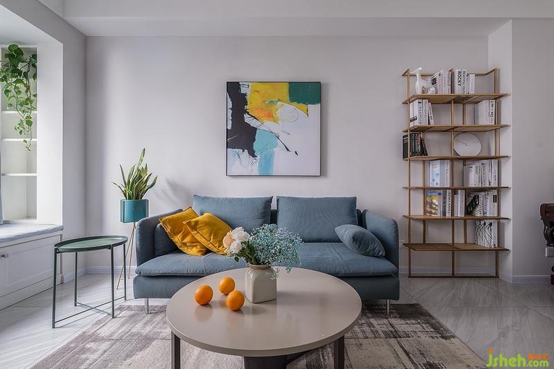 简洁为主,素雅的色彩搭配,挂画上的一抹黄点亮空间。蓝色沙发上用两只亮黄色抱枕呼应。