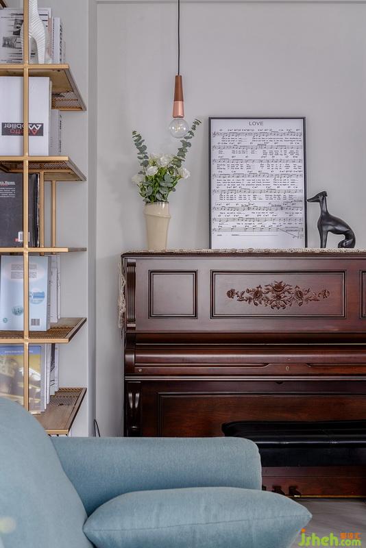 女儿正在学弹钢琴,根据原始房屋结构特点,将客厅一个角落打造成意境十足的钢琴角。旁边的一排书架,还可容纳不少书籍。