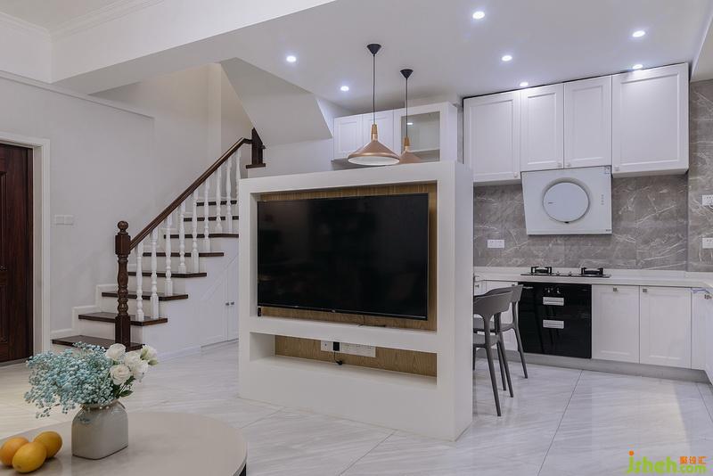隔断式电视背景墙,解决电视悬挂问题,解决客餐厅划分,餐桌有墙可靠增加安全感。