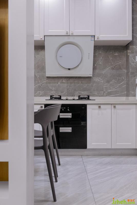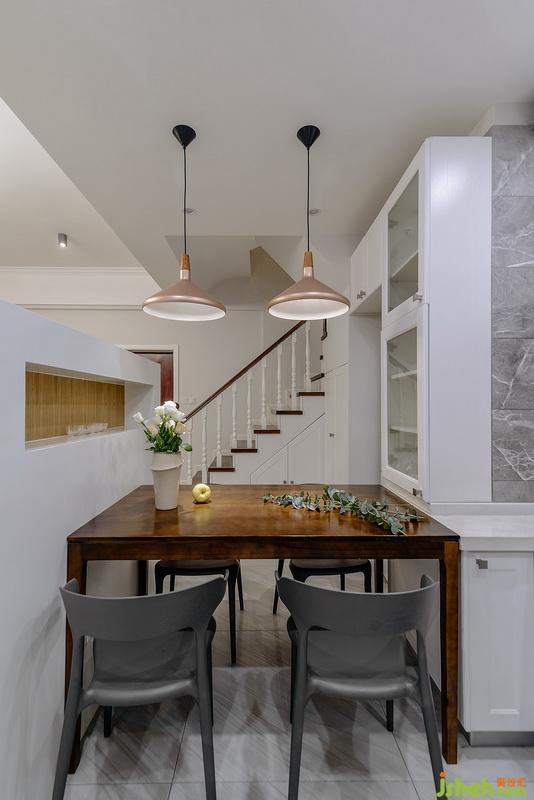 楼梯下方空间室内设计师设计了一整排储物柜子,增加收纳;橱柜也一起连过来靠墙做了通透玻璃高柜,方便后期放置杯子红酒之类物品。