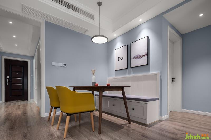 这个视觉看餐厅可以看到中央空调,小户型的空间更是精益求精,如果用上挂机就会失色很多。同样为了节约空间,靠墙设计了卡座,下面可以储物,上面定制了可晒洗垫子,舒适和实用都解决了。