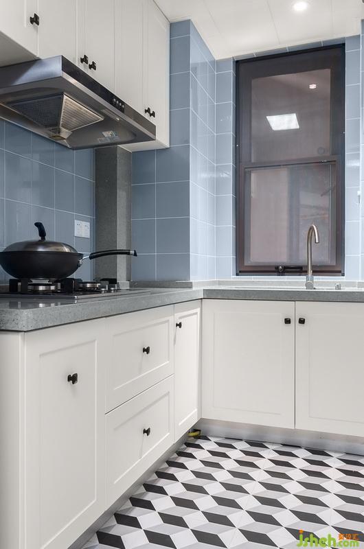 白色橱柜搭配亮面小蓝砖。小花砖很好看就是铺贴人工费有点小高,哈哈。