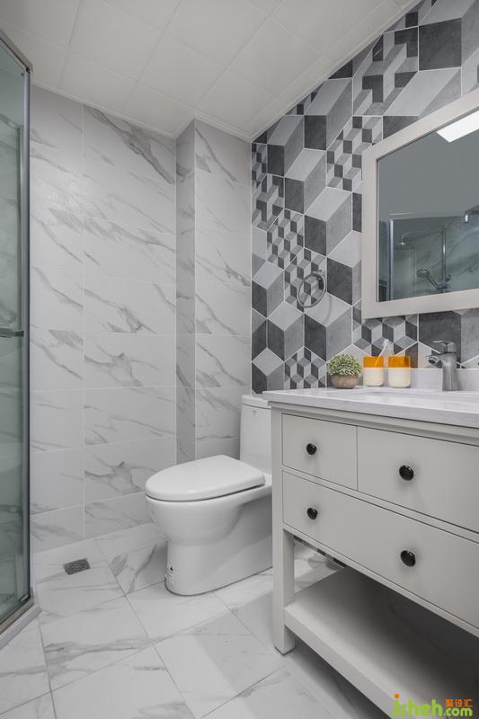 卫生间大面积使用大理石纹路墙地砖,局部配几何小花砖,立体感就这样出来啦。