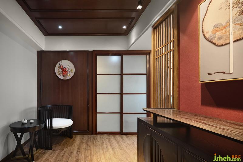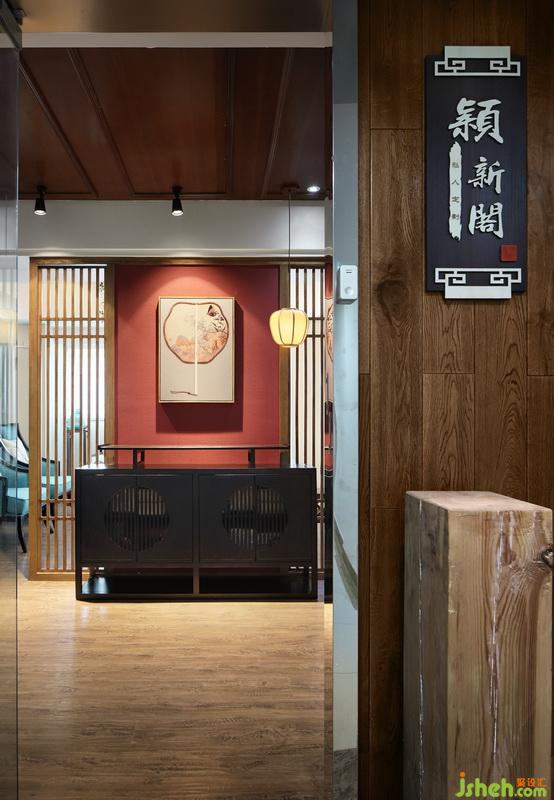 进门入户醒目的店名logo,中式韵味总能沙发出浓浓的高级感。近户门口走廊的护墙板隔断选用了一副梅花挂饰和玄关,呼应相得益彰。