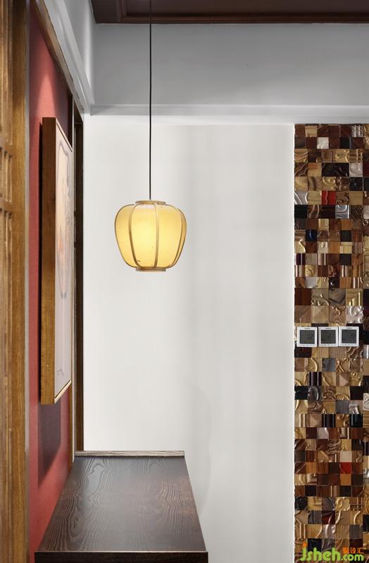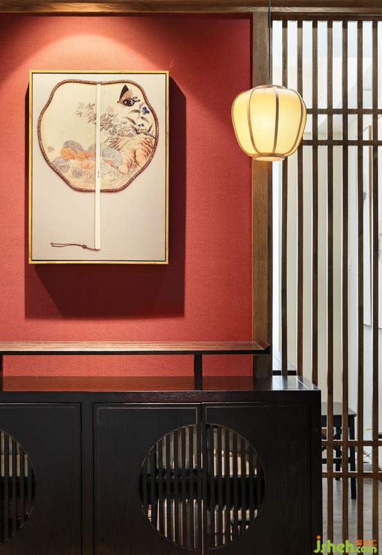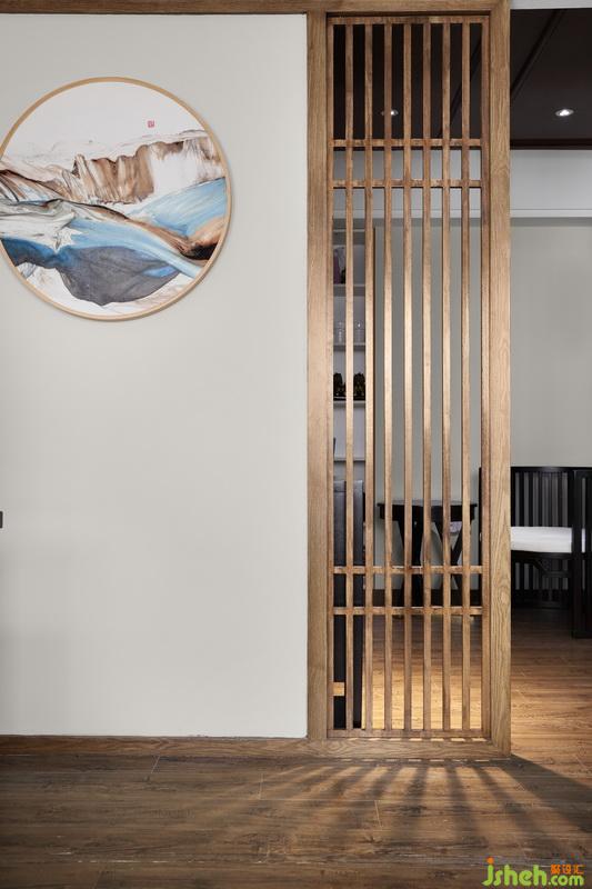 木质隔断备受欢迎,让来访者赏心悦目。搭配一副抽象挂画,和木质隔断相互统一。一盏简约中式小吊灯,简约大方。