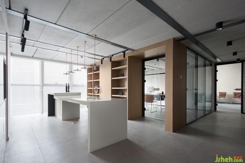 岛台设计与产品陈列展示融合,满足平时员工饮水休憩,客户沟通等功能。大面积落地窗引光入室,室内多采用玻璃、木质、大理石等材质,整个空间自然、质朴、简单而大气。