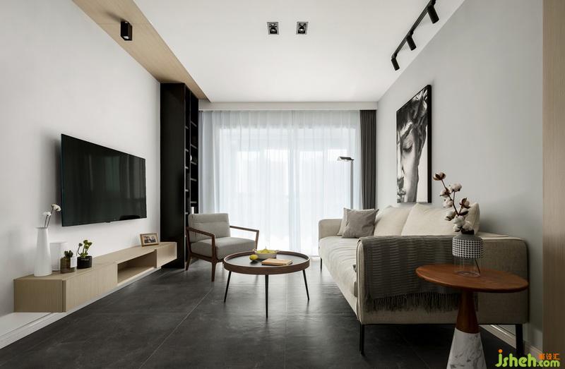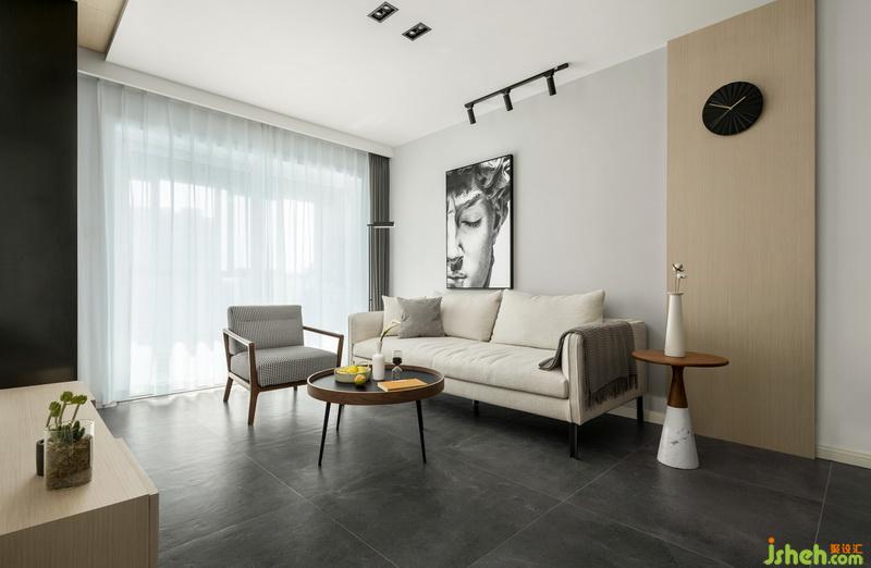 客厅吊顶拉平,无主灯。光源用落地灯、射灯、筒灯结合,局部分散照明可以让空间更有层次感。地面深色调,整个墙面空间都是大面积留白,局部搭配木饰面,想要表达的效果是、稳、空、质。布艺米白色沙发、灰色窗帘,线条落地灯、个性挂画、与空间里的木色元素搭配,让硬朗与柔和的交融。