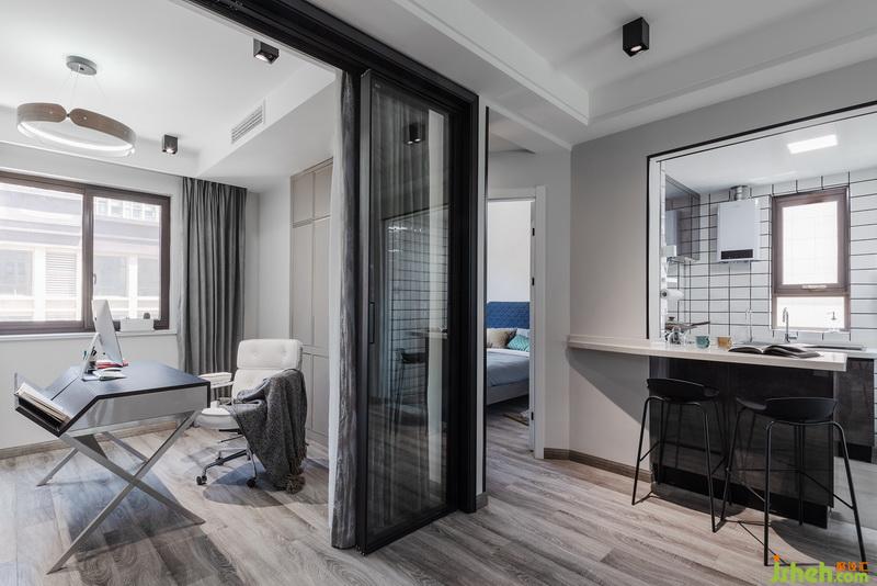 隐与显。书房采用半开放式设计,厨房为开放式厨房,空间的隐蔽与显现结合。重点强调视觉和舒适度。书房的柜子也是嵌入墙体的设计方式,规整空间。