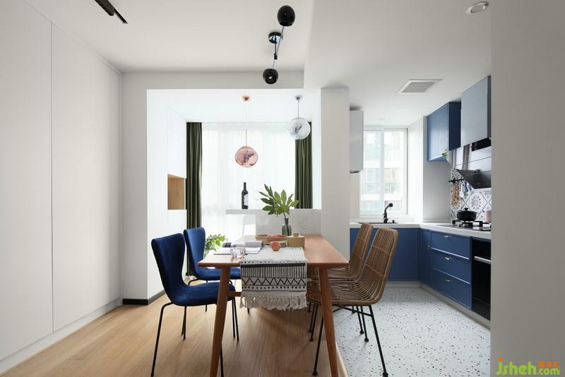 餐厅一组柔和的餐椅组合,复古蓝点缀,营造出轻松舒适的开放空间,个性吊灯提高了整个空间的活跃度。现场制作的一整面白色餐边装饰柜,临窗而设的吧台,静与动自然流畅。