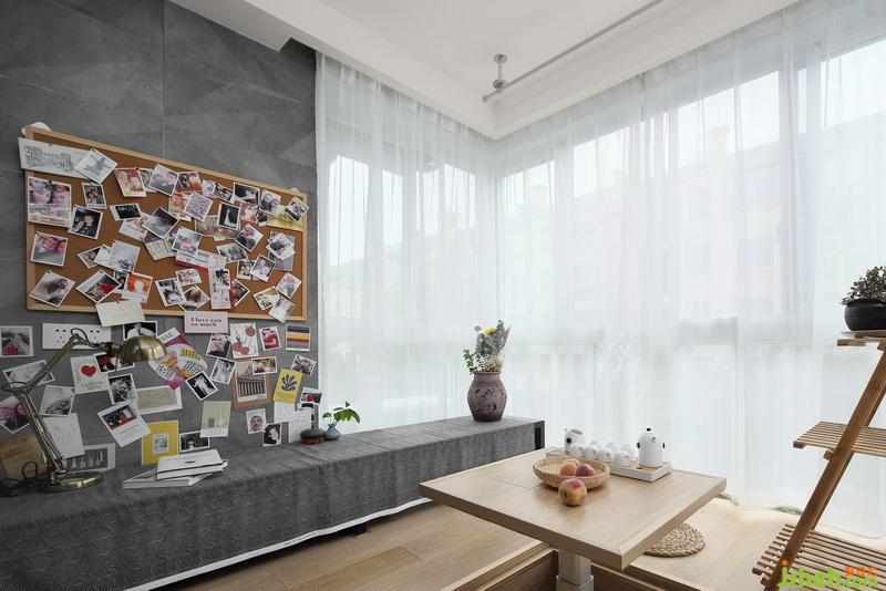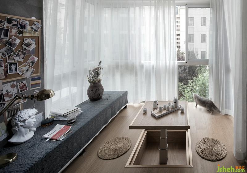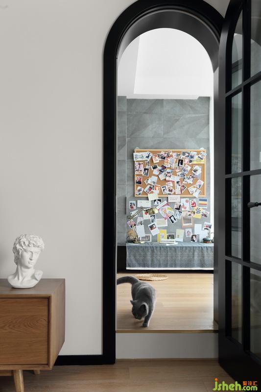 阳台采用了地台抬高设计。三用:休闲、晾晒,小猫二胡的活动空间。拱门设计让空间更柔和,文艺范。