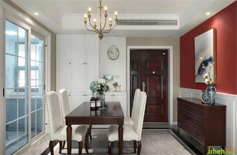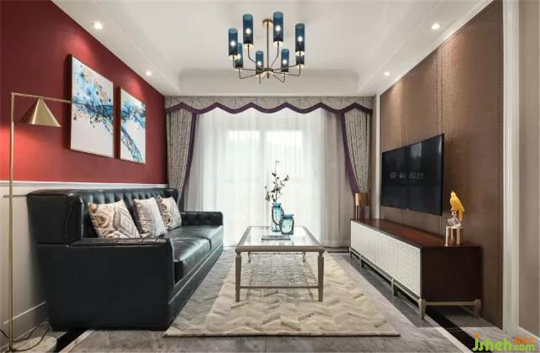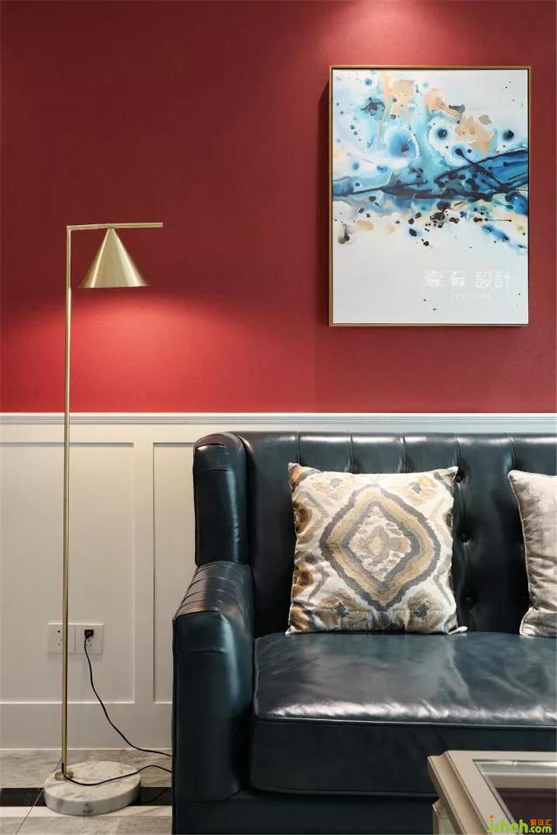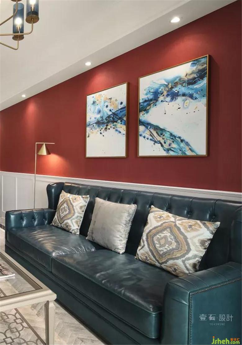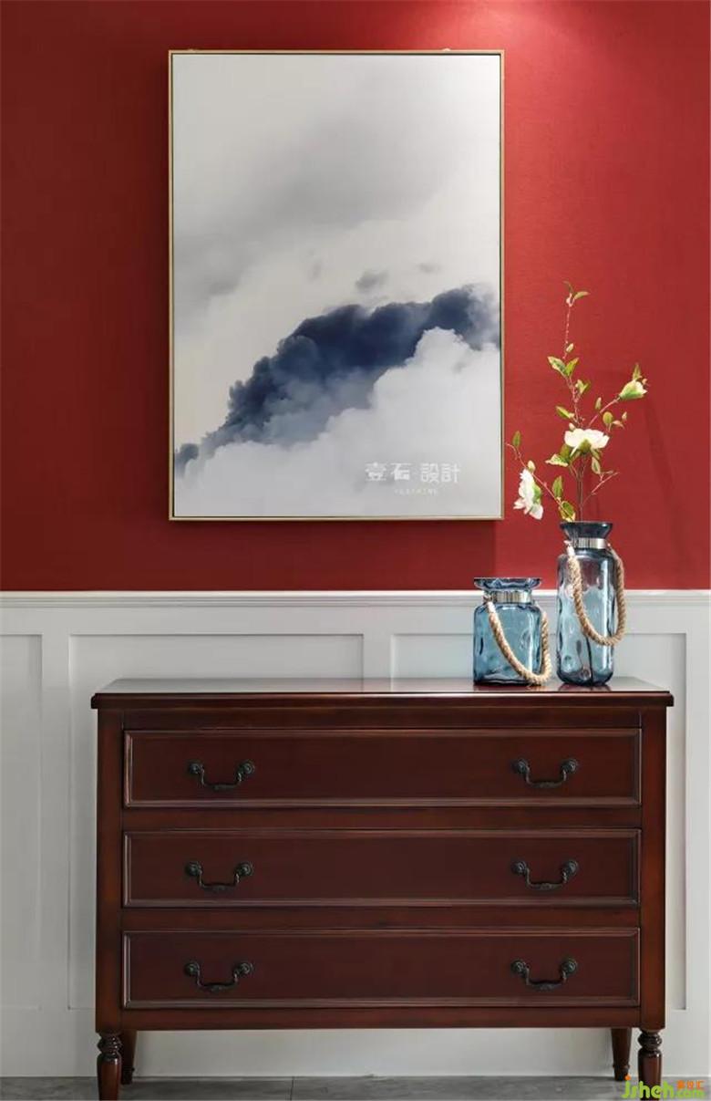 装修公司整体色调温馨为主,选用朱砂红提色,让整个空间鲜活起来;在家装设计中,亮色只可小面积使用,多则不宜。