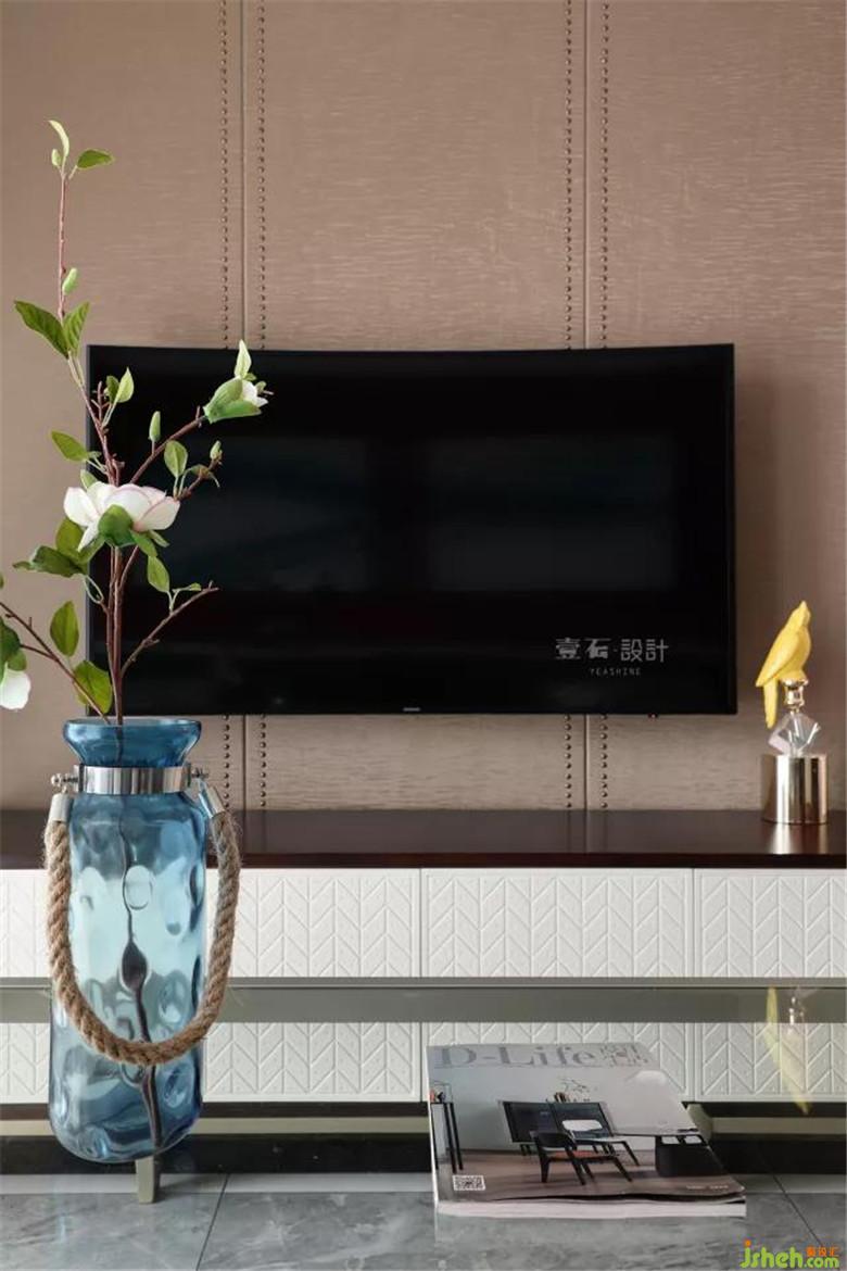 电视背景墙,装修公司选用了质感较好的硬包加金色铆钉。