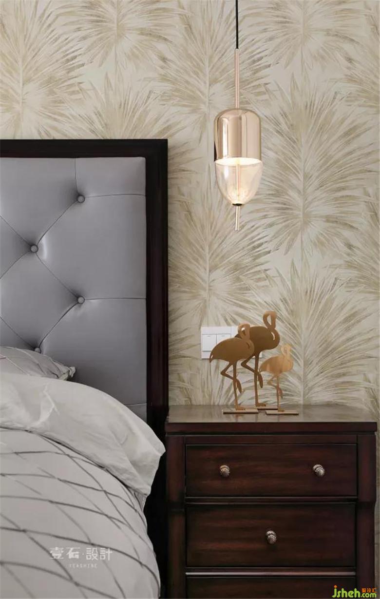 装修公司选用的床头吊灯,仿佛悬挂的是一串风铃细腻优雅和饰品,墙纸图案相映成趣。