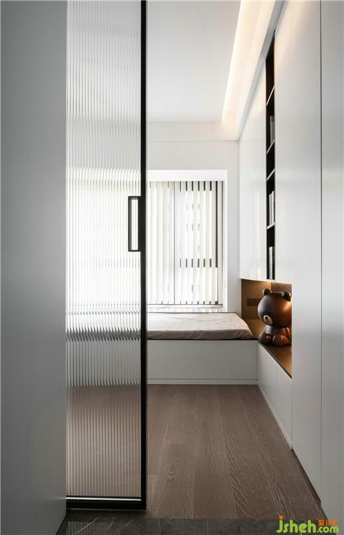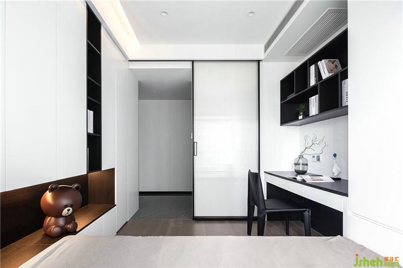 书房兼客房,一室多功能。长虹玻璃划分空间,又让光线通透。