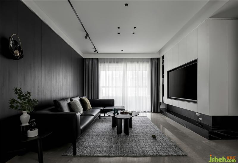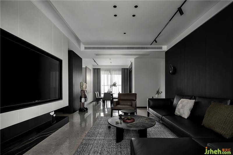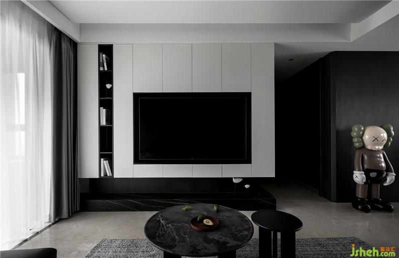 设计将原有玄关和客厅电视背景连为一体,进一步扩大延伸了视觉空间,并且增加了客厅的储物空间,满足了功能需求。