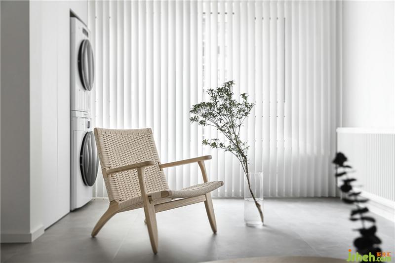 阳台选用了木条纹百叶帘,叶片垂直叠加,明媚的日子,阳光透过空隙穿入室内,自成一道风景。