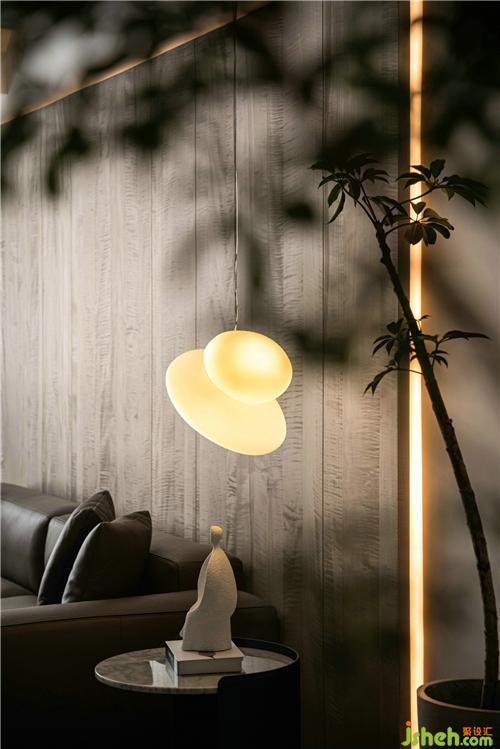 顶部是无主灯设计但留有一排射灯让顶面更有层次立体感;梁结构无法改变,所以做了弧度圆润处理,提升美感。